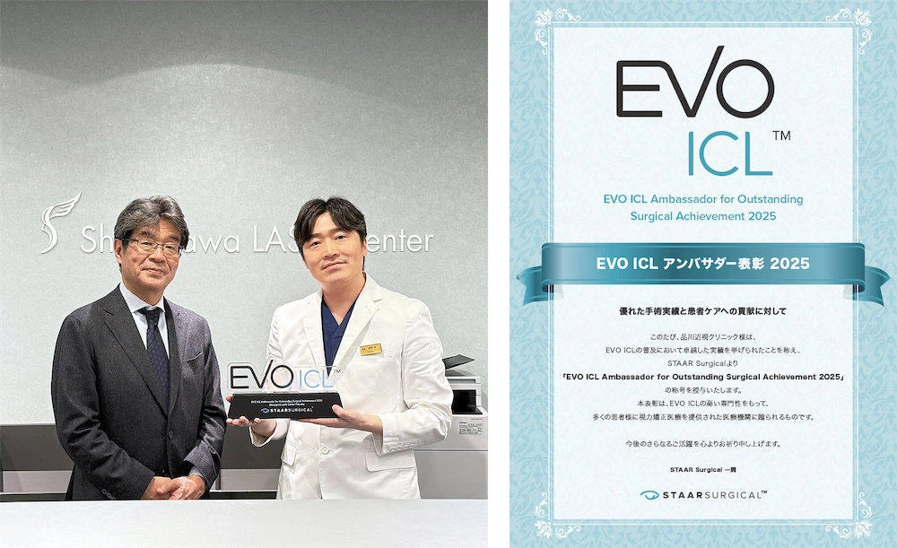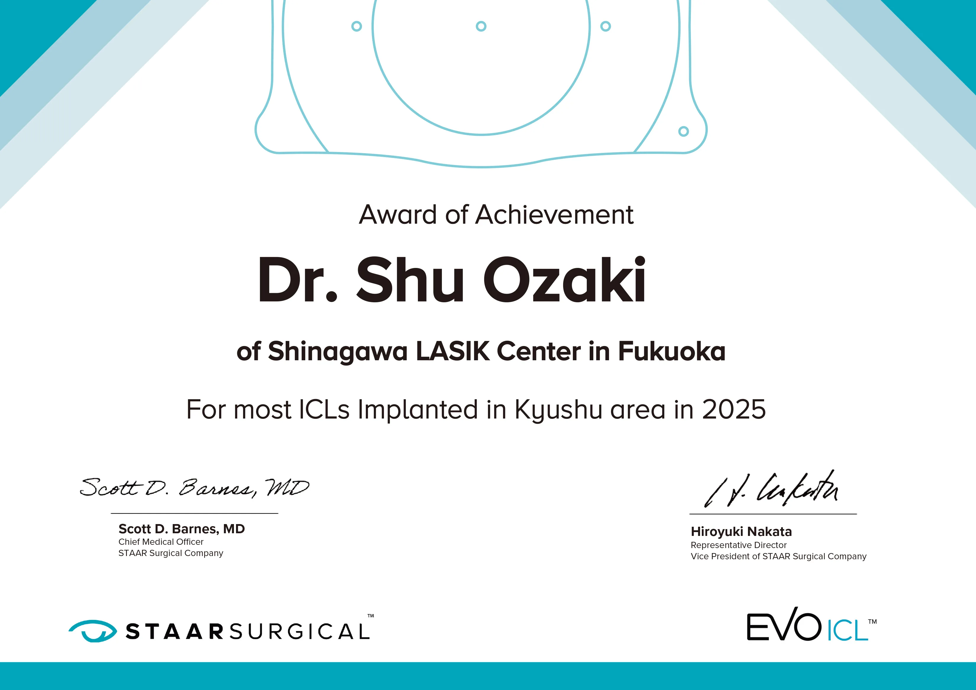 2025年12月、STAAR SURGICALの日本法人であるスターサージカル株式会社代表の中田博之氏からEVO ICL Ambassador for Outstanding Surgical Achievement を受賞しました。
