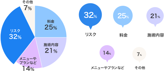 まずはリスクについて、知りたいという方が32%、続いて料金が25%、施術内容21%、メニューやプランなどについてが14%という結果になりました。
