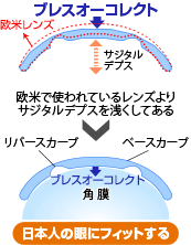 一般的に、日本人の角膜は欧米人の角膜に比べ、中央部の突出が少ない形状になっています。中央部の突出が少ない角膜形状には、サジタルデプスが浅めのレンズがフィットします。