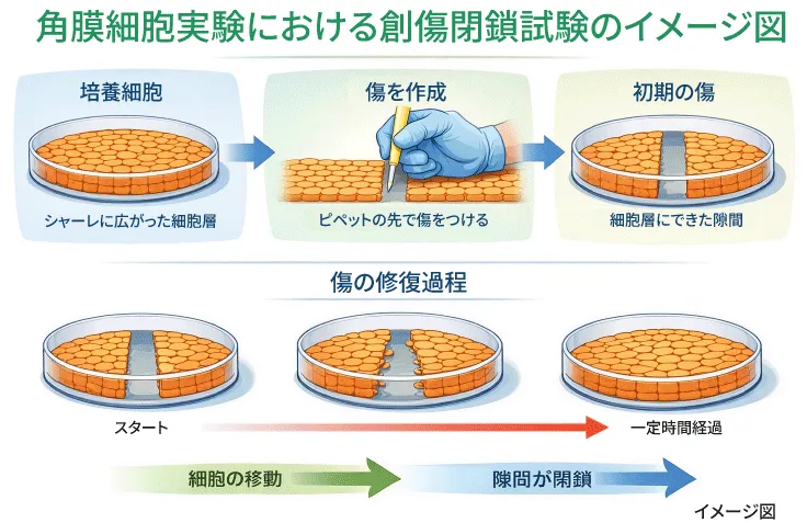 角膜細胞の細胞実験では、人工的に作成した隙間が、スーパーネイタントを用いた条件でより早く埋まることが報告されています。